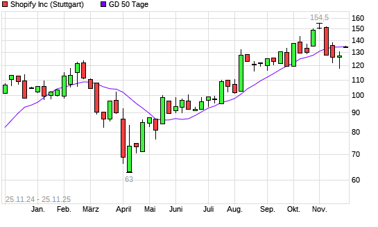 Mit dem Anstieg auf 134,68 EUR hat die Shopify-Aktie am 24.11.2025 die 50-Tage-Linie nach oben gekreuzt.Die Shopify-Aktie befindet sich seit dem 03.07.2025 im langfristigen Aufwärtstrend und ...weiterlesen