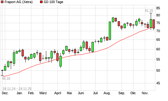 Mit dem Rücksetzer auf 70,95 EUR hat die Fraport-Aktie am 18.11.2025 die 100-Tage-Linie nach unten gekreuzt.Die Fraport-Aktie befindet sich seit dem 08.11.2024 im langfristigen Aufwärtstrend ...weiterlesen