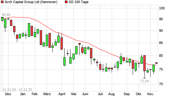 Mit dem Anstieg auf 76,92 EUR hat die Arch Capital Group-Aktie am 10.11.2025 die 100-Tage-Linie nach oben gekreuzt.Die Arch Capital Group-Aktie befindet sich seit dem 21.01.2025 im langfristigen ...weiterlesen
