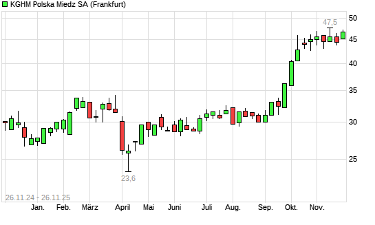 Mit dem Anstieg auf 47,25 EUR hat die KGHM Polska Miedz-Aktie (ISIN PLKGHM000017) am 25.11.2025 ein neues 3-Jahres-Hoch erreicht und damit den Kurs vom 29.10.2025 eingestellt.Die KGHM Polska ...weiterlesen