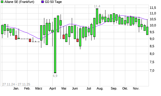 Mit dem Rücksetzer auf 10,40 EUR hat die Allane-Aktie am 26.11.2025 die 50-Tage-Linie nach unten gekreuzt.Die Allane-Aktie befindet sich seit dem 25.11.2025 im langfristigen Aufwärtstrend ...weiterlesen