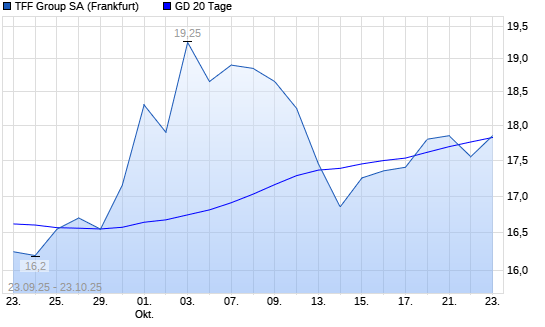 Mit dem Rücksetzer auf 17,55 EUR hat die TFF Group-Aktie am 22.10.2025 die 20-Tage-Linie nach unten gekreuzt.Die TFF Group-Aktie befindet sich seit dem 23.05.2024 im langfristigen Abwärtstrend ...weiterlesen