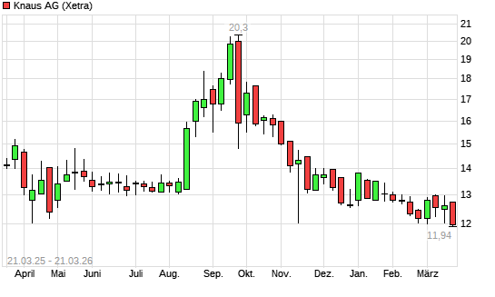 Mit dem Rücksetzer auf 11,96 EUR hat die Knaus Tabbert-Aktie (ISIN DE000A2YN504) am 20.03.2026 ein neues 12-Monats-Tief erreicht und damit den Kurs vom 19.03.2026 ...weiterlesen