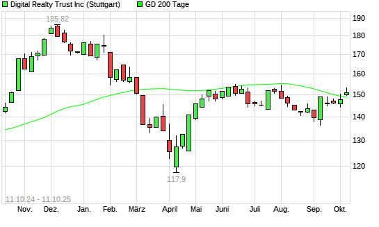 Mit dem Rücksetzer auf 145,36 EUR hat die Digital Realty Trust-Aktie am 10.10.2025 die 200-Tage-Linie nach unten gekreuzt.Die Digital Realty Trust-Aktie befand sich seit dem 03.10.2025 ...weiterlesen