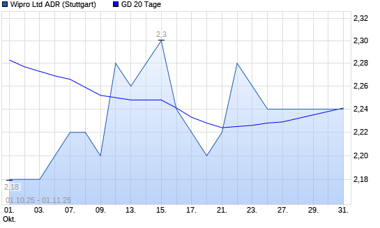 Mit dem Anstieg auf 2,30 EUR hat die Wipro ADR-Aktie am 31.10.2025 die 20-Tage-Linie nach oben gekreuzt.Der Abstand zur 200-Tage-Linie beträgt aktuell -12,14%. ...weiterlesen