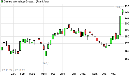 Mit dem Anstieg auf 224,60 EUR hat die Games Workshop Group-Aktie (ISIN GB0003718474) am 26.11.2025 ein neues All-Time-High erreicht und damit den Kurs vom 25.11.2025 eingestellt.Die Games Workshop ...weiterlesen