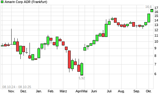 Mit dem Anstieg auf 16,20 EUR hat die Amarin Corporation-Aktie (ISIN US0231114044) am 07.10.2025 ein neues 12-Monats-Hoch erreicht und damit den Kurs vom 06.10.2025 eingestellt.Der Abstand ...weiterlesen