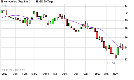 Mit dem Rücksetzer auf 13,81 EUR hat die Kenvue-Aktie am 18.11.2025 die 50-Tage-Linie nach unten gekreuzt.Die Kenvue-Aktie befindet sich seit dem 29.05.2025 im langfristigen Abwärtstrend ...weiterlesen