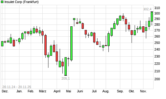 Mit dem Anstieg auf 300,50 EUR hat die Insulet Corp-Aktie (ISIN US45784P1012) am 19.11.2025 ein neues 12-Monats-Hoch erreicht und damit den Kurs vom 09.09.2025 eingestellt.Die Insulet Corp-Aktie ...weiterlesen
