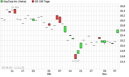 Mit dem Anstieg auf 15,51 EUR hat die KeyCorp-Aktie am 10.11.2025 die 100-Tage-Linie nach oben gekreuzt.Die KeyCorp-Aktie befindet sich seit dem 31.10.2025 im langfristigen Aufwärtstrend und ...weiterlesen