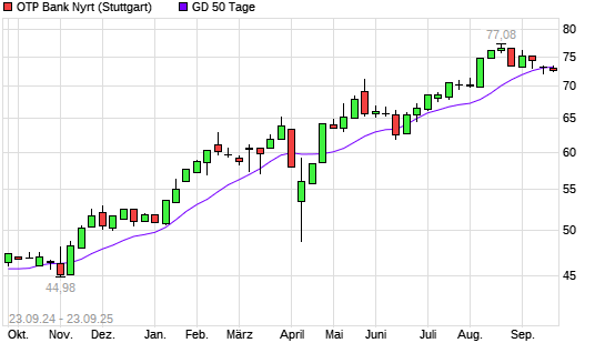 Mit dem Anstieg auf 74,48 EUR hat die OTP Bank-Aktie am 22.09.2025 die 50-Tage-Linie nach oben gekreuzt.Die OTP Bank-Aktie befindet sich seit dem 08.08.2024 im langfristigen Aufwärtstrend und ...weiterlesen