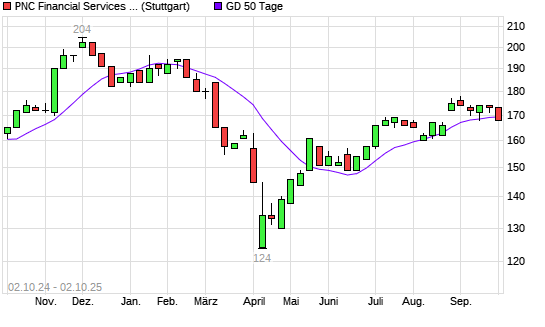 Mit dem Rücksetzer auf 168,00 EUR hat die PNC Financial Services-Aktie am 01.10.2025 die 50-Tage-Linie nach unten gekreuzt.Die PNC Financial Services-Aktie befindet sich seit dem 25.08.2025 ...weiterlesen