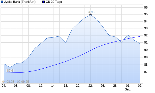 Mit dem Rücksetzer auf 91,35 EUR hat die Jyske Bank-Aktie am 02.09.2025 die 20-Tage-Linie nach unten gekreuzt.Die Jyske Bank-Aktie befindet sich seit dem 25.04.2025 im langfristigen Aufwärtstrend ...weiterlesen