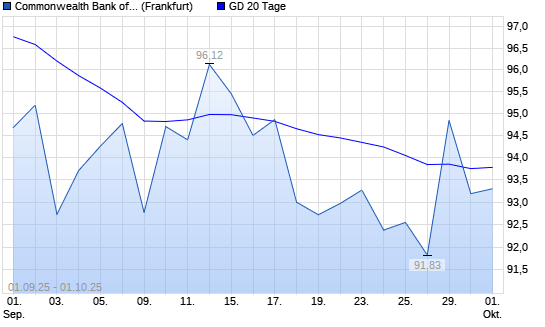 Mit dem Rücksetzer auf 93,19 EUR hat die Commonwealth Bank-Aktie am 30.09.2025 die 20-Tage-Linie nach unten gekreuzt.Die Commonwealth Bank-Aktie befindet sich seit dem 16.09.2025 im langfristigen ...weiterlesen