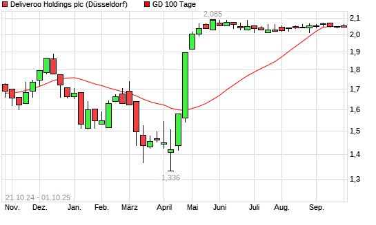 Mit dem Anstieg auf 2,03 EUR hat die Deliveroo-Aktie am 20.10.2025 die 100-Tage-Linie nach oben gekreuzt.Die Deliveroo-Aktie befindet sich seit dem 25.04.2025 im langfristigen Aufwärtstrend ...weiterlesen