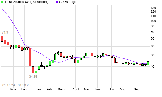 Mit dem Anstieg auf 43,26 EUR hat die 11 BIT STUDIOS SA-Aktie am 30.09.2025 die 50-Tage-Linie nach oben gekreuzt.
