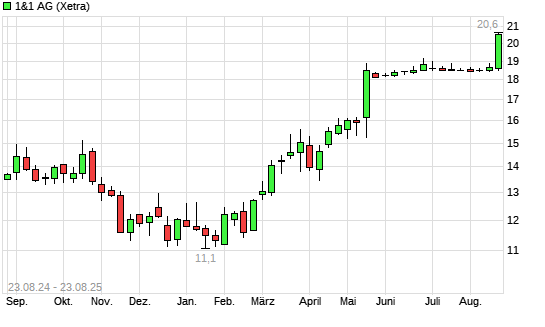 Mit dem Anstieg auf 20,00 EUR hat die 1&1 Drillisch-Aktie (ISIN DE0005545503) am 22.08.2025 ein neues 3-Jahres-Hoch erreicht und damit den Kurs vom 24.01.2024 eingestellt.
