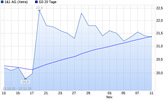 Mit dem Rücksetzer auf 20,85 EUR hat die 1&1 Drillisch-Aktie am 11.11.2025 die 20-Tage-Linie nach unten gekreuzt.