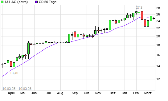 Mit dem Rücksetzer auf 25,00 EUR hat die 1&1 Drillisch-Aktie am 09.03.2026 die 50-Tage-Linie nach unten gekreuzt.Die 1&1 Drillisch-Aktie befindet sich seit dem 05.03.2025 ...weiterlesen