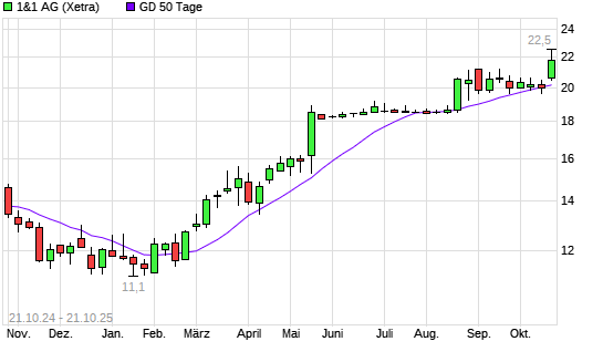 Mit dem Anstieg auf 22,30 EUR hat die 1&1 Drillisch-Aktie am 20.10.2025 die 50-Tage-Linie nach oben gekreuzt.Die 1&1 Drillisch-Aktie befindet sich seit dem 05.03.2025 im langfristigen Aufwärtstrend ...weiterlesen