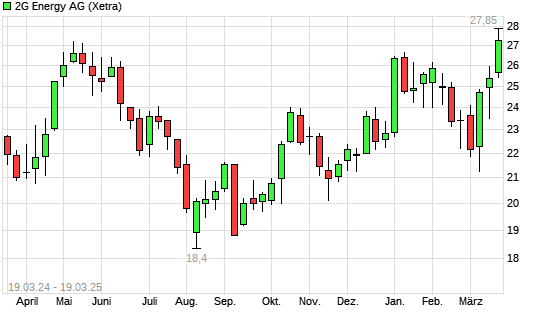Mit dem Anstieg auf 27,80 EUR hat die 2G Energy-Aktie (ISIN DE000A0HL8N9) am 18.03.2025 ein neues 12-Monats-Hoch erreicht und damit den Kurs vom 17.03.2025 eingestellt.
