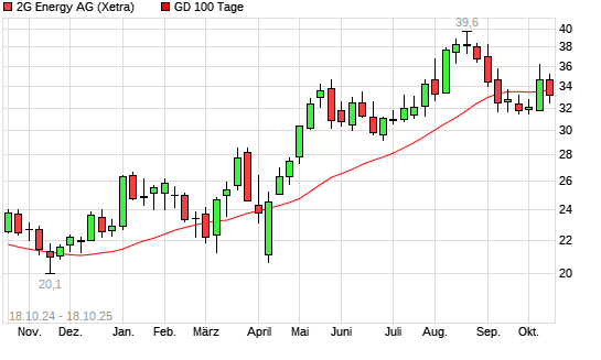 Mit dem Rücksetzer auf 33,45 EUR hat die 2G Energy-Aktie am 17.10.2025 die 100-Tage-Linie nach unten gekreuzt.