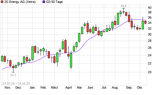 Mit dem Rücksetzer auf 34,85 EUR hat die 2G Energy-Aktie am 13.10.2025 die 50-Tage-Linie nach unten gekreuzt.