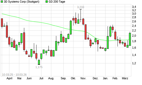 Mit dem Anstieg auf 2,11 EUR hat die 3D Systems-Aktie am 09.03.2026 die 200-Tage-Linie nach oben gekreuzt.