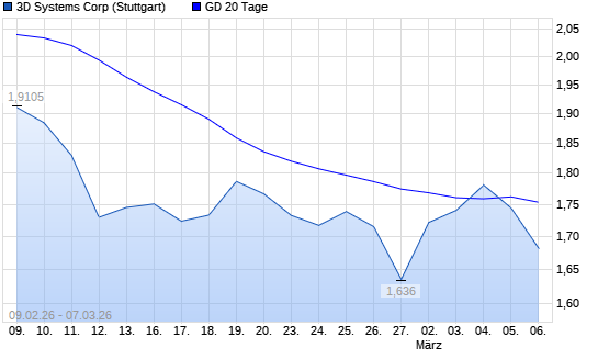 Mit dem Rücksetzer auf 1,69 EUR hat die 3D Systems-Aktie am 06.03.2026 die 20-Tage-Linie nach unten gekreuzt.