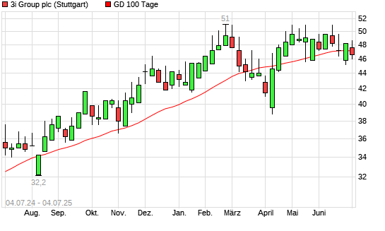 Mit dem Rücksetzer auf 47,40 EUR hat die 3I Group-Aktie am 03.07.2025 die 100-Tage-Linie nach unten gekreuzt.