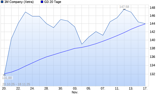 Mit dem Rücksetzer auf 142,72 EUR hat die 3M-Aktie am 17.11.2025 die 20-Tage-Linie nach unten gekreuzt.