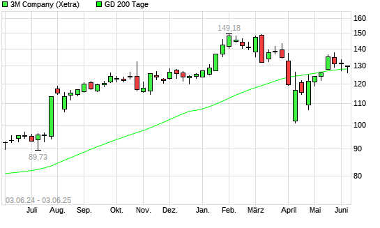 Mit dem Rücksetzer auf 127,70 EUR hat die 3M-Aktie am 02.06.2025 die 200-Tage-Linie nach unten gekreuzt.