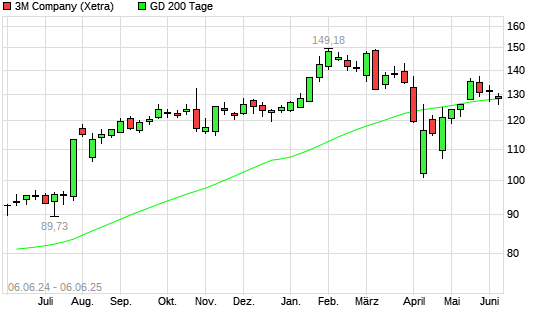 Mit dem Rücksetzer auf 128,20 EUR hat die 3M-Aktie am 05.06.2025 die 200-Tage-Linie nach unten gekreuzt.