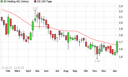 Mit dem Anstieg auf 1,65 EUR hat die 3U Holding-Aktie am 10.01.2025 die 100-Tage-Linie nach oben gekreuzt.