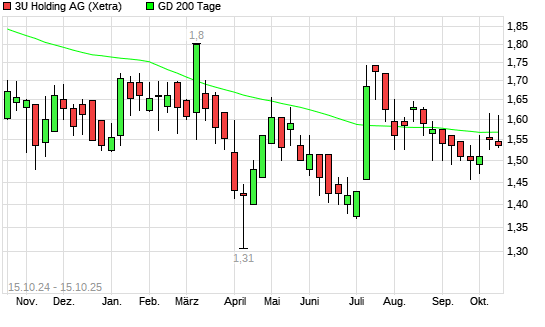 Mit dem Rücksetzer auf 1,52 EUR hat die 3U Holding-Aktie am 14.10.2025 die 200-Tage-Linie nach unten gekreuzt.