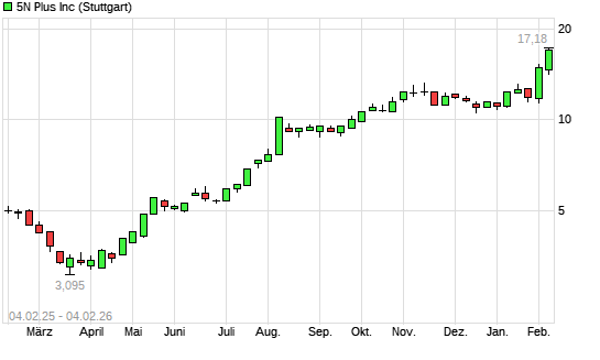 Mit dem Anstieg auf 16,58 EUR hat die 5N Plus-Aktie (ISIN CA33833X1015) am 03.02.2026 ein neues All-Time-High erreicht und damit den Kurs vom 02.02.2026 eingestellt.