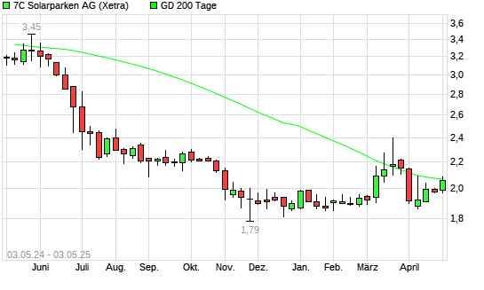 Mit dem Anstieg auf 2,05 EUR hat die 7C Solarparken-Aktie am 02.05.2025 die 200-Tage-Linie nach oben gekreuzt.