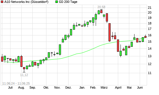 Mit dem Rücksetzer auf 15,75 EUR hat die A10 Networks-Aktie am 10.06.2025 die 200-Tage-Linie nach unten gekreuzt.