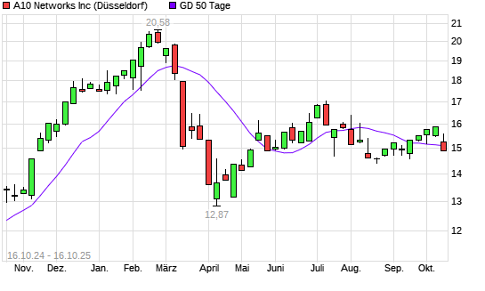 Mit dem Rücksetzer auf 14,91 EUR hat die A10 Networks-Aktie am 15.10.2025 die 50-Tage-Linie nach unten gekreuzt.
