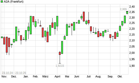 Mit dem Anstieg auf 2,35 EUR hat die A2A-Aktie (ISIN IT0001233417) am 22.10.2025 ein neues 6-Monats-Hoch erreicht und damit den Kurs vom 11.06.2025 eingestellt.