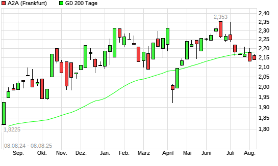 Mit dem Rücksetzer auf 2,15 EUR hat die A2A-Aktie am 07.08.2025 die 200-Tage-Linie nach unten gekreuzt.