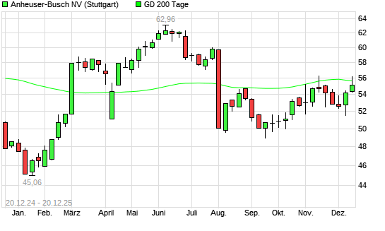Mit dem Rücksetzer auf 55,44 EUR hat die AB InBev-Aktie am 19.12.2025 die 200-Tage-Linie nach unten gekreuzt.