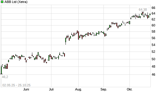 Mit dem Anstieg auf 63,46 EUR hat die ABB-Aktie (ISIN CH0012221716) am 24.10.2025 ein neues All-Time-High erreicht und damit den Kurs vom 13.10.2025 eingestellt.