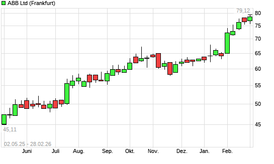 Mit dem Anstieg auf 78,46 EUR hat die ABB-Aktie (ISIN CH0012221716) am 27.02.2026 ein neues All-Time-High erreicht und damit den Kurs vom 25.02.2026 eingestellt.