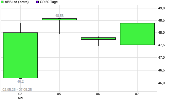 Mit dem Rücksetzer auf 47,81 EUR hat die ABB-Aktie am 06.05.2025 die 50-Tage-Linie nach unten gekreuzt.
