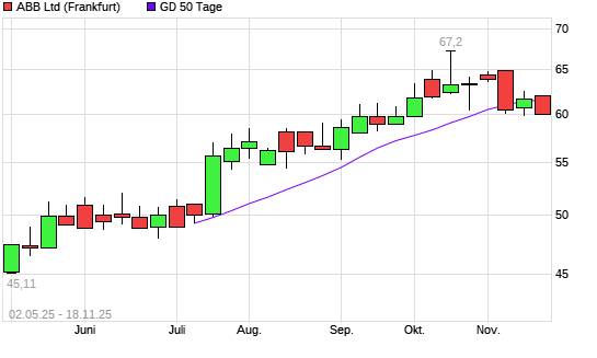 Mit dem Rücksetzer auf 60,40 EUR hat die ABB-Aktie am 17.11.2025 die 50-Tage-Linie nach unten gekreuzt.