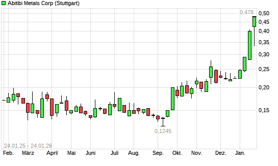 Mit dem Anstieg auf 0,47 EUR hat die ABITIBI METALS-Aktie (ISIN CA00367M1086) am 23.01.2026 ein neues All-Time-High erreicht und damit den Kurs vom 29.02.2024 eingestellt.