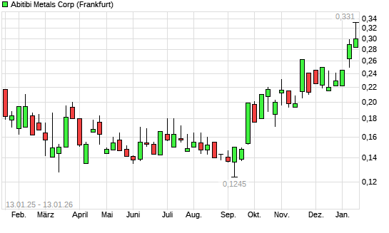 Mit dem Anstieg auf 0,33 EUR hat die ABITIBI METALS-Aktie (ISIN CA00367M1086) am 12.01.2026 ein neues 12-Monats-Hoch erreicht und damit den Kurs vom 09.01.2026 eingestellt.Die ABITIBI METALS-Aktie ...weiterlesen