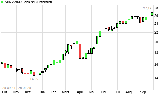Mit dem Anstieg auf 27,13 EUR hat die ABN Amro Group-Aktie (ISIN NL0011540547) am 24.09.2025 ein neues 5-Jahres-Hoch erreicht und damit den Kurs vom 23.09.2025 eingestellt.