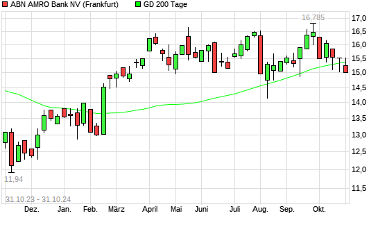 Mit dem Rücksetzer auf 15,21 EUR hat die ABN Amro Group-Aktie am 30.10.2024 die 200-Tage-Linie nach unten gekreuzt.